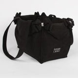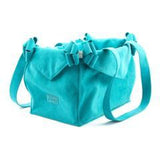 The classic Nouveau Bow is centered with 4 rows of genuine Swarovski crystals. Made of genuine Ultrasuede fabric that is soft to the touch yet will maintain it's durability for years to come. Included is a custom matching fur carrier blanket that keeps your dog cozy and nestled while on the go. Approximate dimensions are 8" wide X 8" high. The 12" long base has hidden support which is flexible and not too rigid. 14" high straps are the ideal height for carrying in comfort. Capacity is roughly 8 lbs. Included is a snap hook to attach to your dog's collar or harness. This item can be washed in cold water then hang to dry.