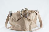 Carry your dog in pure luxury & beauty that is sure to last. The Doe Plaid Nouveau Bow maintains it's class with centered rows of genuine Swarovski crystals. Made of genuine Ultrasuede fabric that is soft to the touch yet will maintain it's durability for years to come. Included is a custom matching fur carrier blanket that keeps your dog cozy and nestled while on the go. Approximate dimensions are 8" wide X 8" high. The 12" long base has hidden support which is flexible and not too rigid. 14" high straps are the ideal height for carrying in comfort. Capacity is roughly 8 lbs. Included is a snap hook to attach to your dog's collar or harness. This item can be washed in cold water then hang to dry.