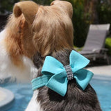 Our Nouveau Bow collection gives you the best of style and plenty of bling - using our Giltmore Crystal. Comfortable for the dog, easy for you to maintain and constructed from a nearly indestructible material, this collar is a good value that will last a long time. In addition to that, the fabric gives you a wide range of colors – from soft pastels to vibrant hues. Like all of our designs, it is made from genuine commercial upholstery grade Ultrasuede® fabric that we import from Japan and only Swarovski Crystal. This soft, comfortable fabric is breathable, washable and colorfast. Best of all it is manufactured in the USA.