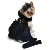 This designer wool coat has a pure black fur collar and a pleated skirt. This super high-quality coat is a harness style with a touch fastener neck and chest closures. It comes with a matching leash and the D-ring provides an easy leash attachment. Made with super high-quality wool blend for extra warmth and lined with "ultra-rich" satin. Adorned with designer brass buttons and velvet bows at the waist.