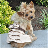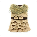 This very stylish camel wool coat has a very classic look with a ruffled skirting and multi tone accents of darker brown. We also added a cute bow tie for an extra touch. It also has a multi colored faux fur collar and is fully lined. Our wool coats all include a matching leash and the product has a built in D-ring for easy walking.