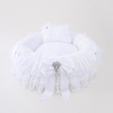 There are no words to describe this gorgeous Anastasia bed by Hello Doggie. Trimmed with romantic lace and adorned by white satin bows which are embellished with rhinestones. This bed is available in 2 sizes and features a large teardrop crystal brooch and removable inner-pillow for easy washing.